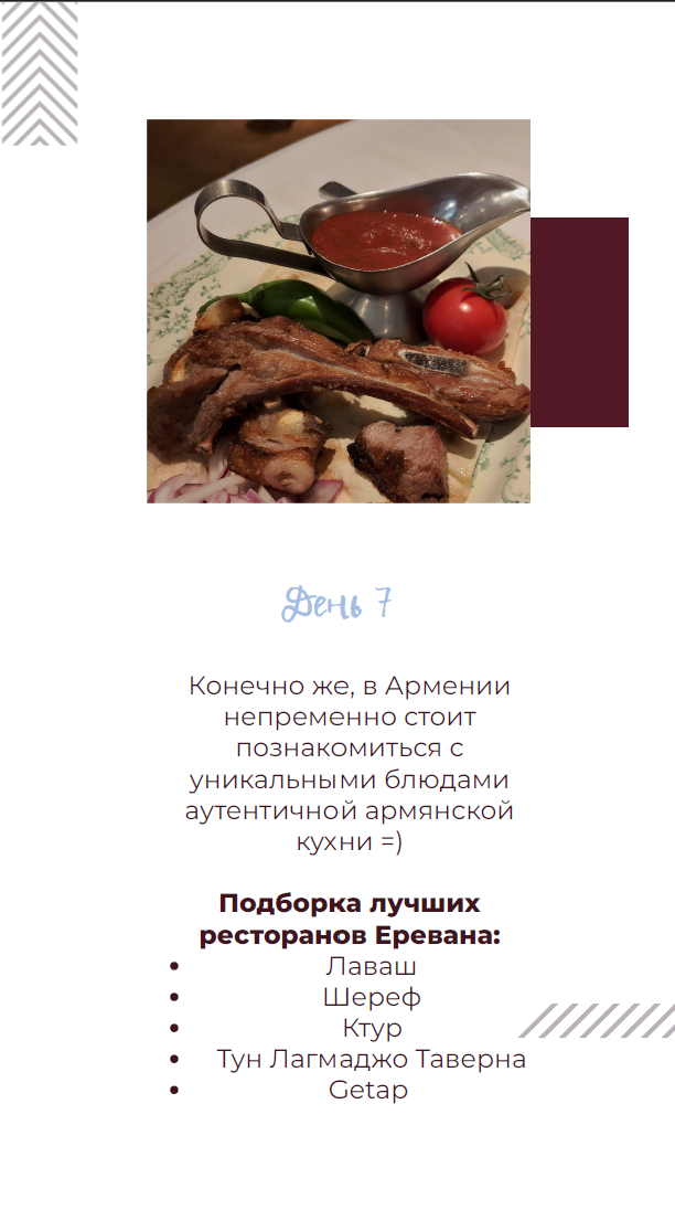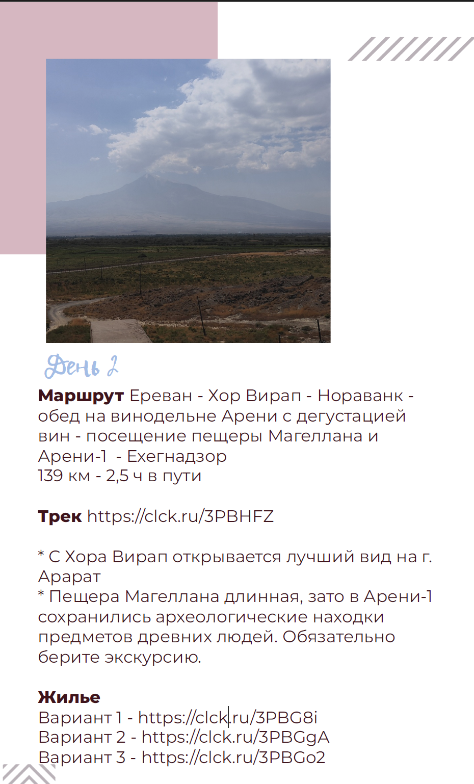В гиде я собрала для вас маршрут на 7 дней по самым сочным достопримечательностям Армении. Для каждого дня составлен трек с важными уточнениями на маршруте, а также подобраны варианты жилья.